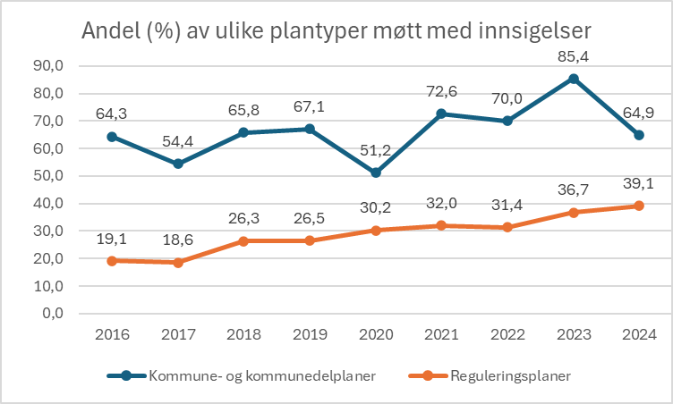 Det har vært en høyere andel innsigelser til kommune- og kommunedelplaner enn til reguleringsplaner, se figur 2. Overordnede planer berører trolig flere personer og temaer.