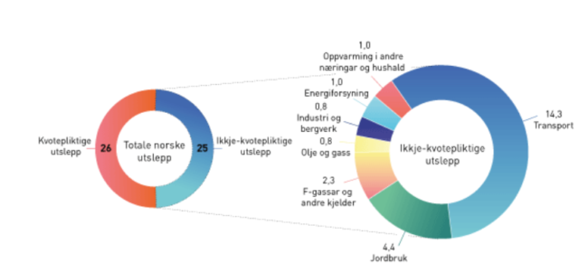 Det totale ikke-kvotepliktige utslippet var på 25,6 mill tonn CO2ekv i 2019, det vil si en reduksjon på 11 % siden 2005 (Klima- og miljødepartementet 2021).
