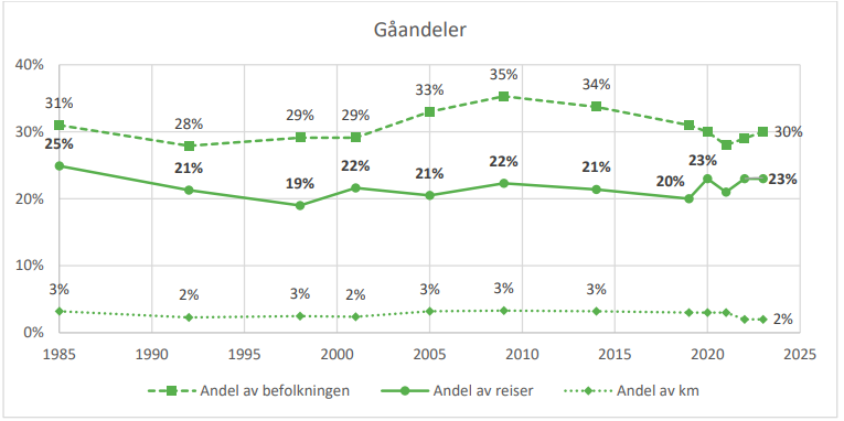 I 1985 gjennomførte 31 prosent av befolkningen minst en hel reise til fots i løpet av en dag, jf. figur 2. I 2009 økte andelen til 35 prosent, mens den gikk ned igjen til 31 prosent i 2018/19. Årene 2020 og 2021 var preget av redusert reiseaktivitet og endrede reisevaner som følge av koronapandemien, og tendensen til at færre enn før gjennomførte minst en gåtur i løpet av en dag fortsatte. I 2023 foretok 30 prosent av befolkningen minst en hel reise til fots på registreringsdagen. Fram til 2013/14 var utviklingen på vei i riktig retning for å nå målet om minst 50 prosent. Deretter snudde utviklingen, og i dag er det lik andel som gjør en hel reise til fots som i 1985. Rammebetingelsene har imidlertid endret seg siden 1985. Det gjelder kanskje særlig tilgang på mobile tjenester som erstatter en type reiser. Økt netthandel og at særlig ungdom treffes mer digitalt enn fysisk, kan bety at å opprettholde andelen fra 1985 i realiteten er et positivt resultat. Her trengs det imidlertid flere analyser for å kunne gi noen sikre svar.