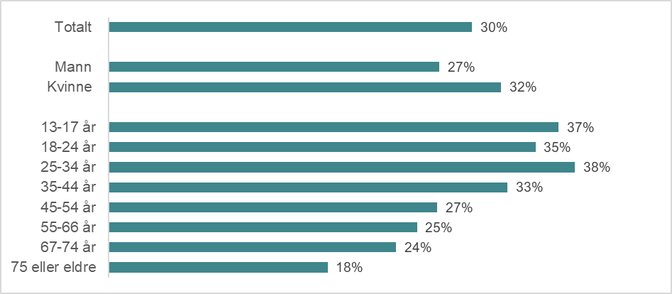 Det er særlig viktig å øke andelen hele reiser til fots i grupper som i dag går lite. Figur 3 viser prosentandel som har foretatt minst en hel reise til fots i løpet av en dag i 2023. Kvinner går oftere enn menn. Aldersmessig er det flest som går blant personer under 18 år, og i aldersgruppen 25-34 år. Det er færrest som går i aldersgruppen blant personer over 74 år.