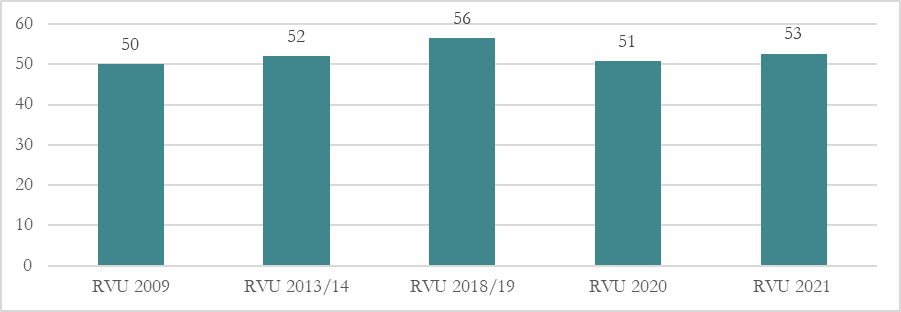 Figur 5: Prosentandel av reiser i nærmiljøet som er til fots. RVU 2009 - 2021. Kilder: eget datauttak.