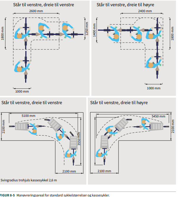 I Norge skal anlegg for syklende dimensjoneres etter vanlige sykler (0,75m bredde 1,8m lengde) og syklende med vogn (1m bredde og 3,1m lengde) (se figur 5). Dette skal gjenspeiles i bredde på anlegg og hvilken svingradius det planlegges for. Oslo operer etter tilsvarende mål. I Gatenormalen til Oslo er det anbefalt å ha 2,2m bredde på oppmerkede sykkelfelt og et såkalt "skal-krav» med 2,2m bredde på opphøyde sykkelfelt (Bymiljøetaten, 2020, s. 62-63). (Både N100 og Oslos gatenormal er under revidering per desember 2025). I tillegg er trehjuls lastesyker nevnt med henvisning til størrelse på sykkelparkering i Oslo (satt til å ofte ha en bredde på 0,9m, Bymiljøetaten, 2020). Mange spesialtilpassede sykler er smalere enn 1 meter, og hensyn til spesialtilpassede sykler kan derfor delvis ivaretas gjennom dimensjonerende bredder for trehjuls lastesykkel og sykkel med vogn. Samtidig finnes det unntak.