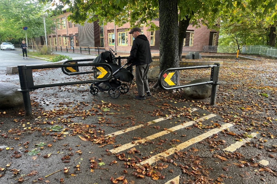 Figur 6: Eksempel på bruk av saksebommer som fartsreduserende tiltak rettet mot sykkel, som kan være til hinder for mennesker som ikke kan gå av sykkelen eller har ekstra brede sykler. Her illustrert med bredde på barnevogn. Foto: Bymiljøetaten