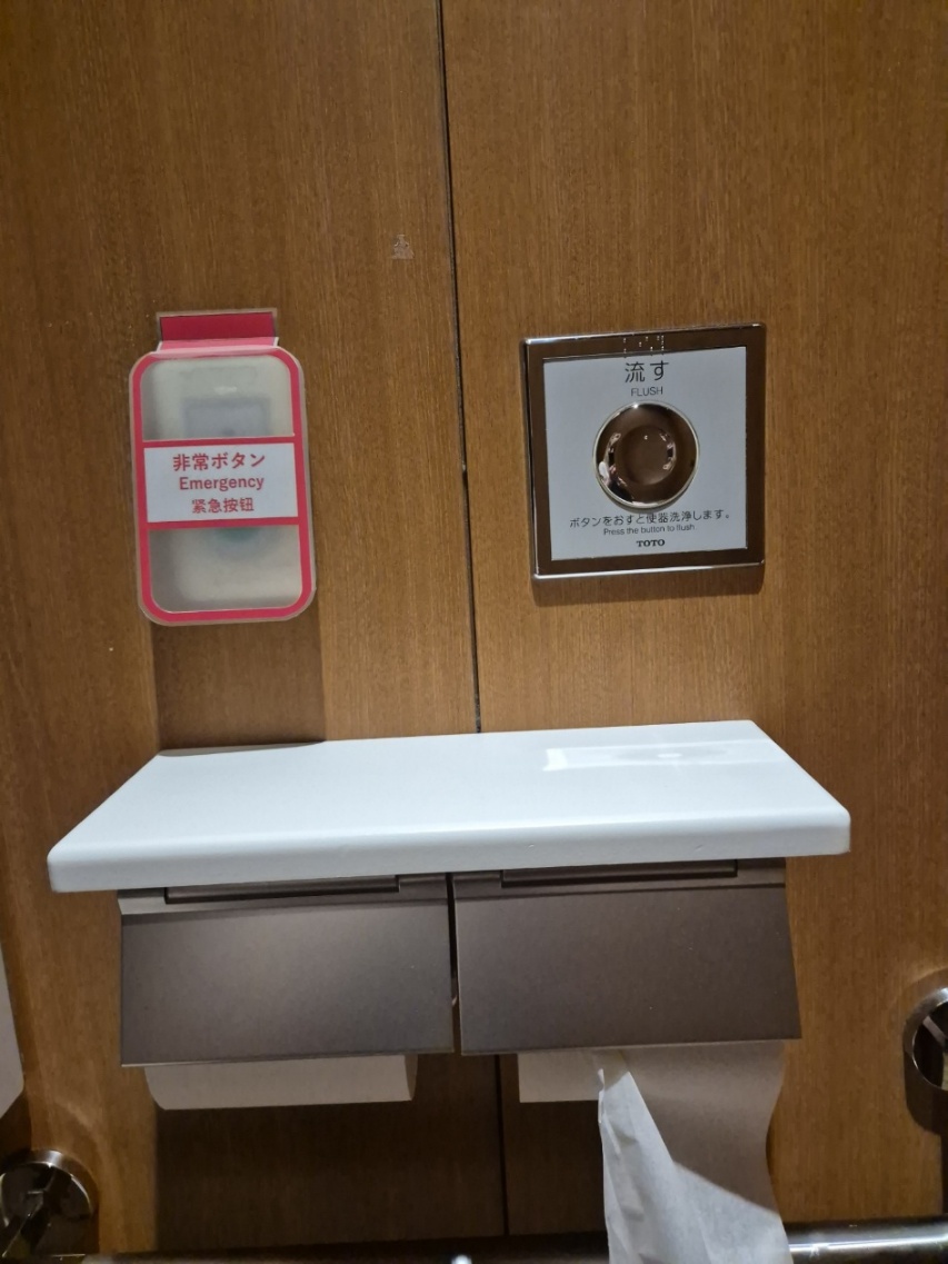 Figur 5: Samtlige toaletter i Japan har hyller over toalettrullene. Dette gjør at man kan legge fra seg utstyr. Her ser vi også en alarmknapp man kan trykke på dersom det skulle skje en nødsituasjon mens man er på toalettet. Dette er relevant for personer med endometriose, anfallssykdommer m.m. Foto: Anja Fleten Nielsen.