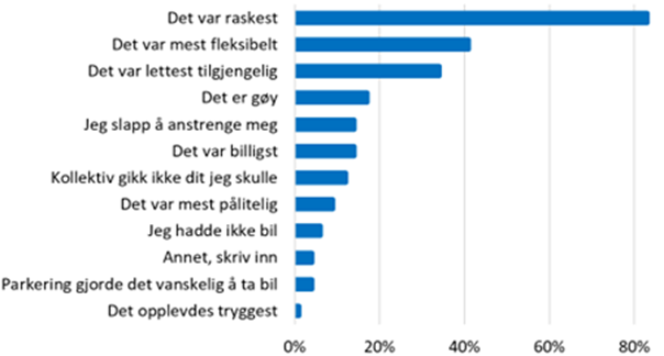 Figur 1: Årsaker til å velge delt elsparkesykkel på siste tur. 2024-survey (Egner og Fearnley, 2025), N=2666
