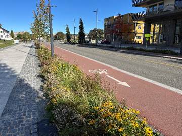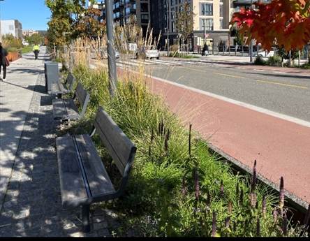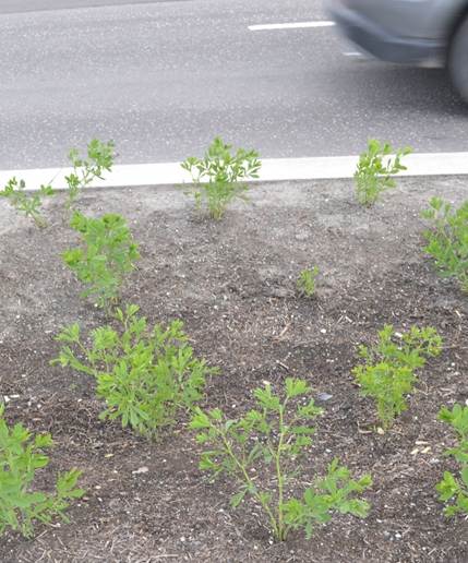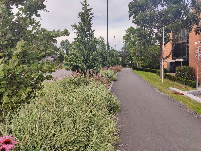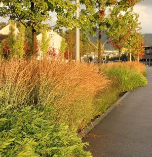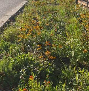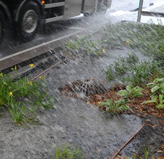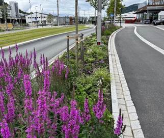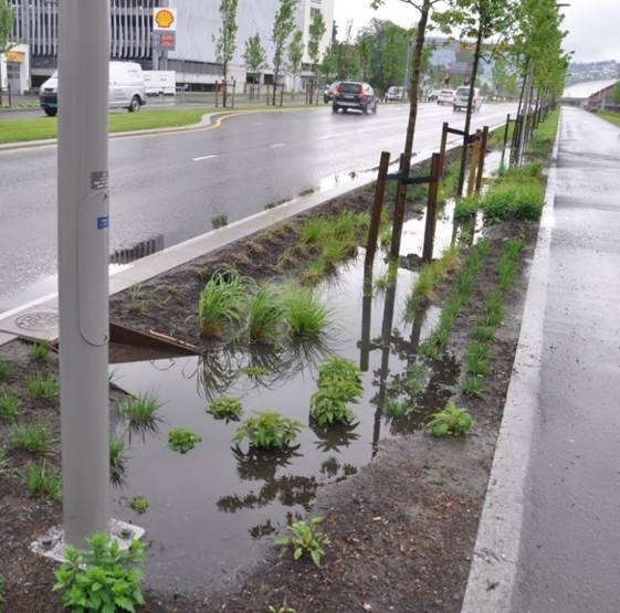 Figur 2: Regnbed i gatemiljø blir blant annet utsatt for salt, sprut og slam, noe som gjør utforming og plantevalg særlig viktig, men også krevende. Foto: Trond K. Haraldsen.