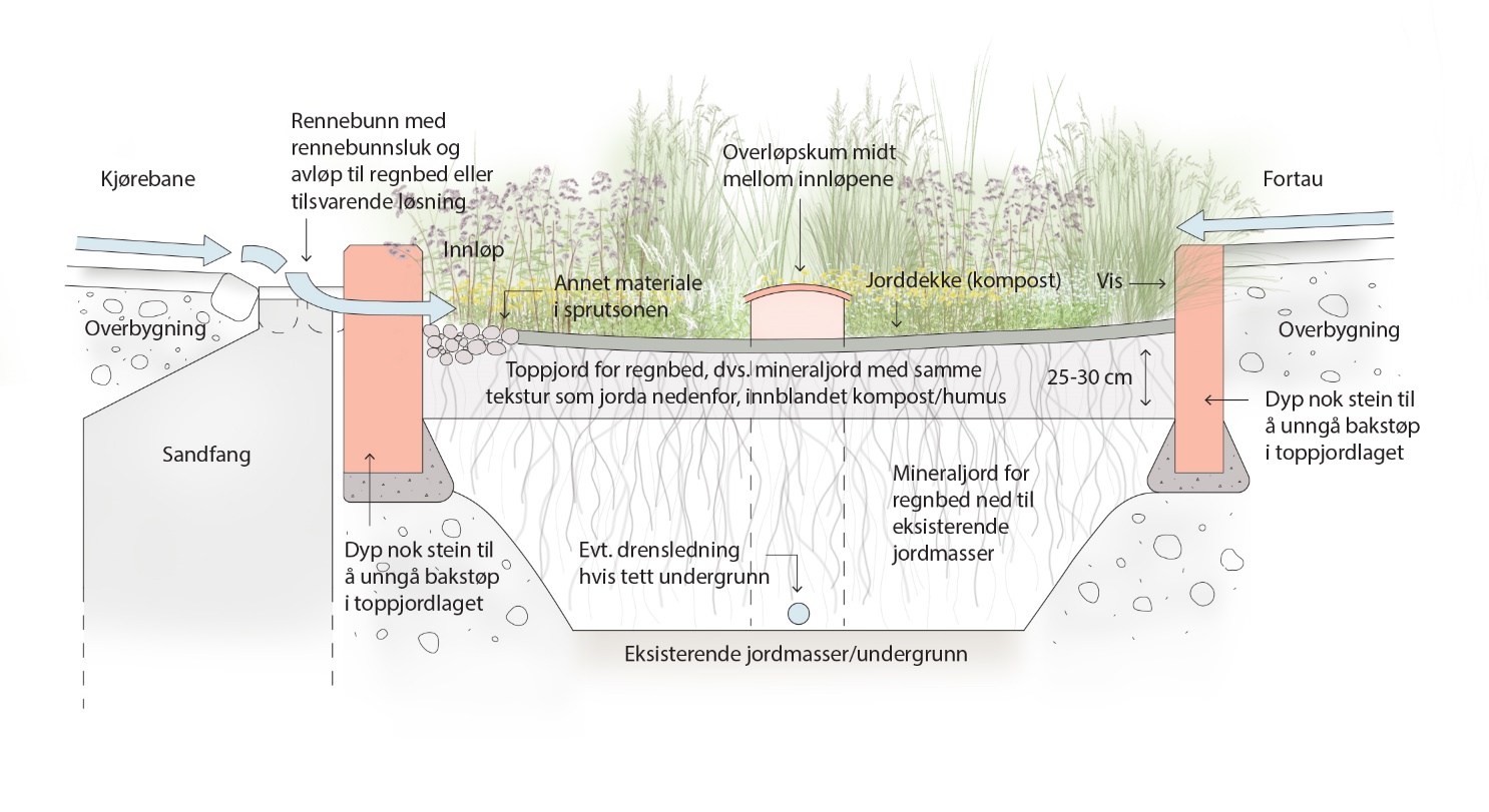 Ved å benytte naturbaserte løsninger lokalt nær kilden, kan kapasiteten til å håndtere flomtopper øke. Det finnes mange typer løsninger, hvorav regnbed blir stadig oftere brukt. Dette er plantefelt utformet som forsenkninger i terrenget slik at overvann samles og deretter infiltrerer i grunnen (figur 1). Regnbed har i tillegg en betydelig renseevne, der samspillet mellom jord, vegetasjon og mikroorganismer er viktig.
